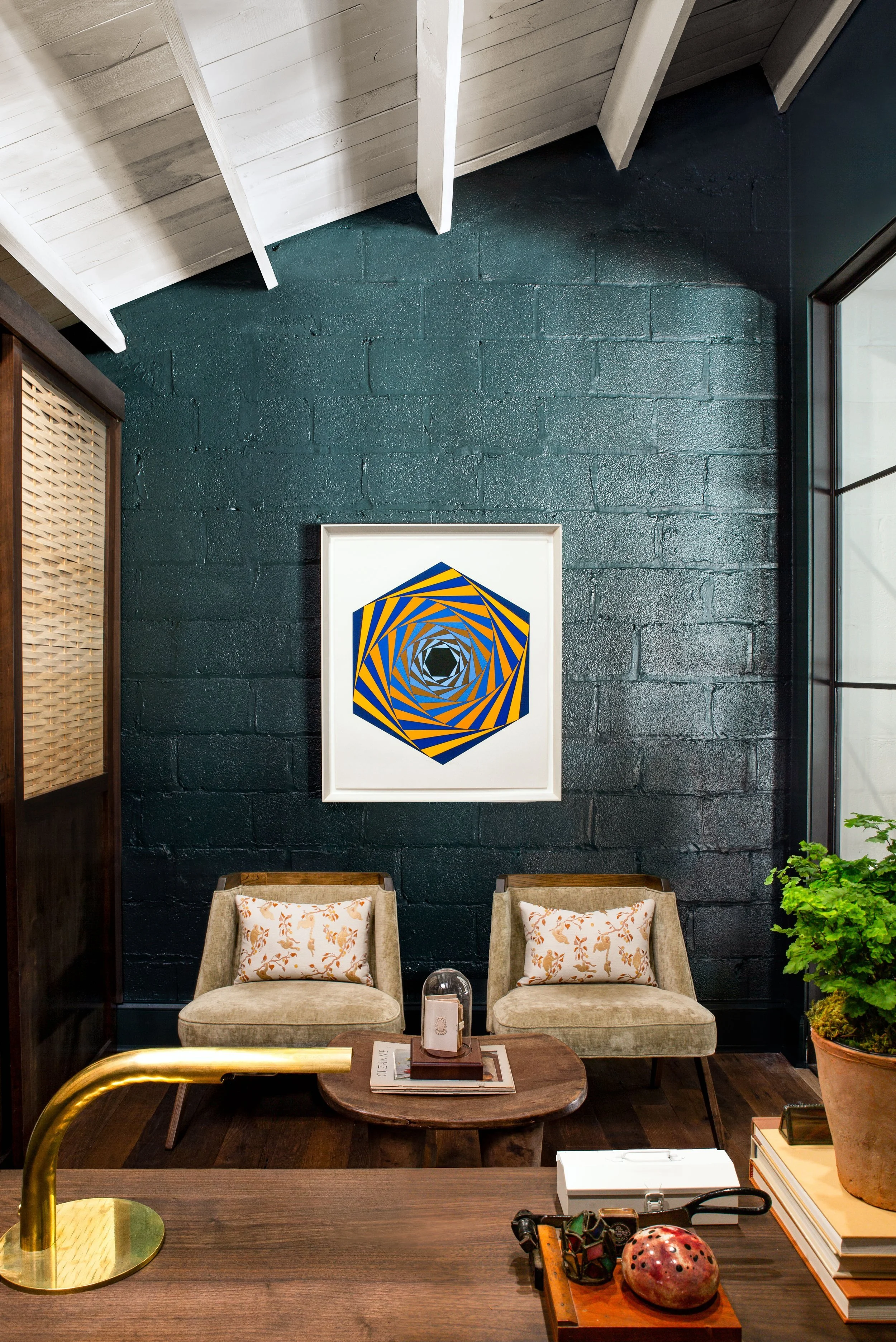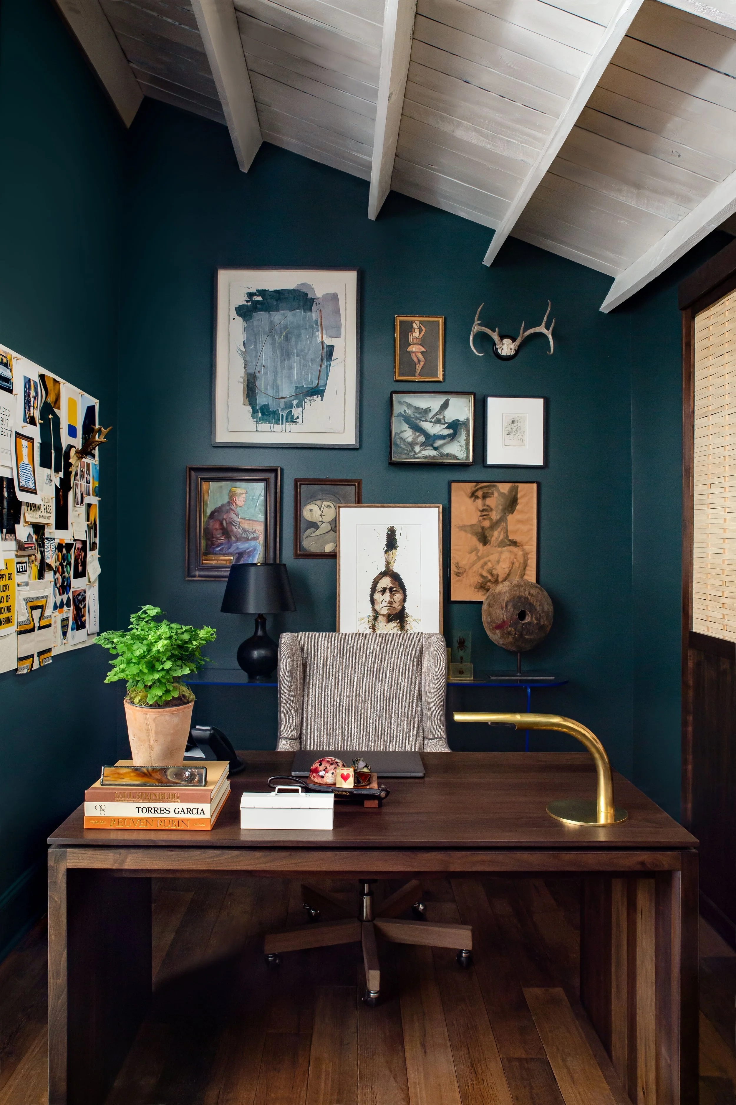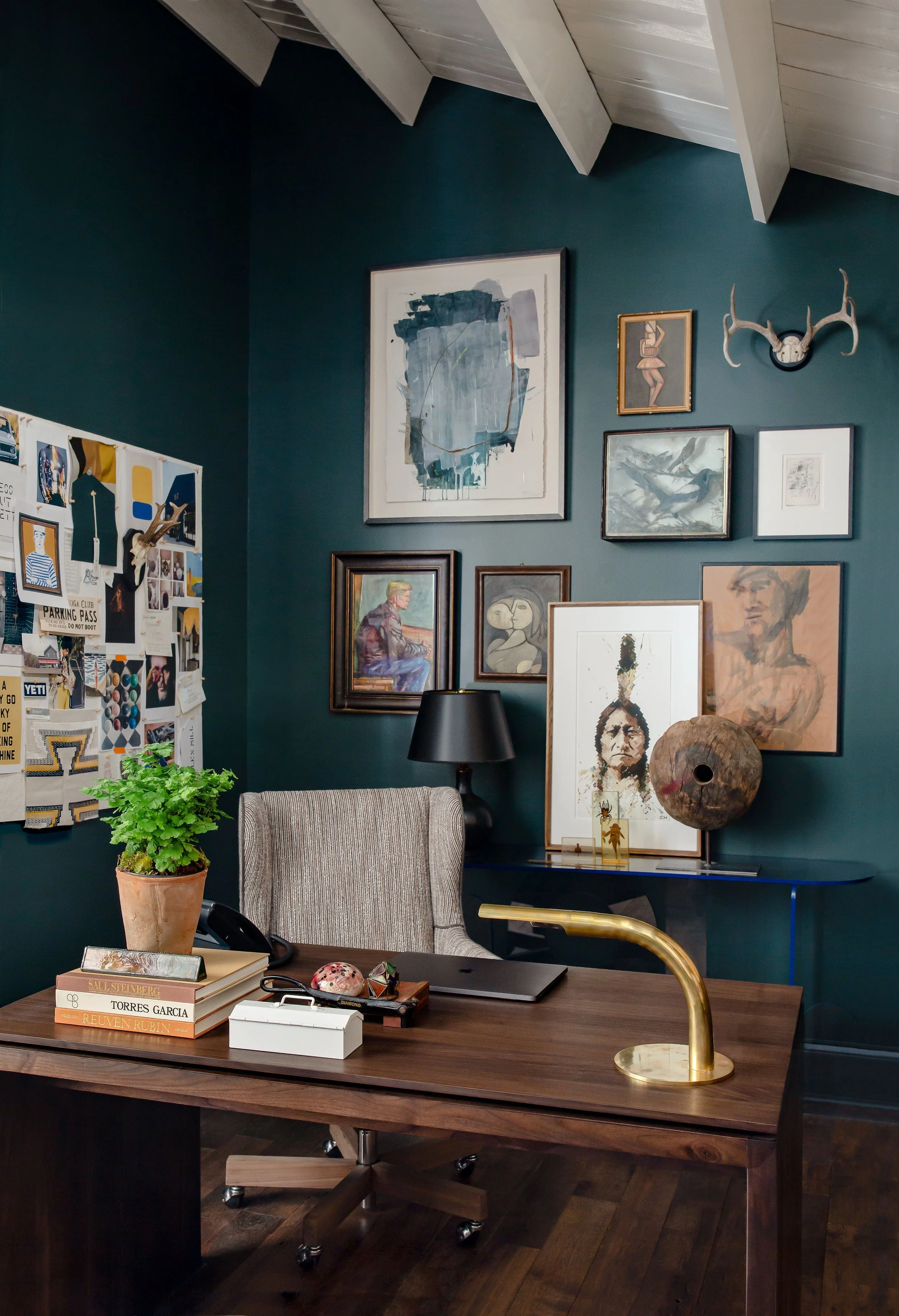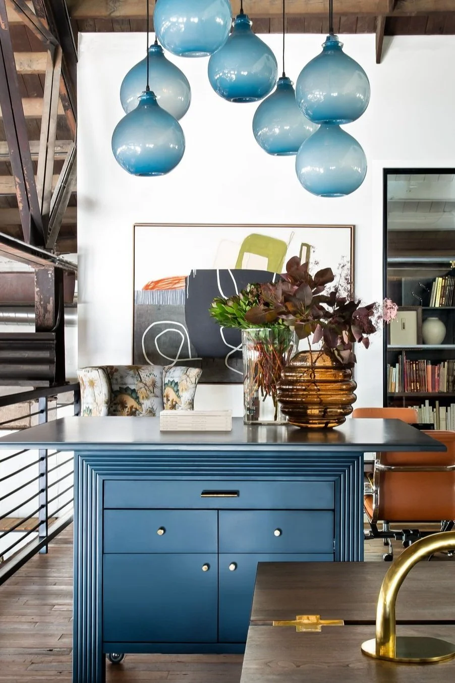 During covid when in person visitation was limited, we took the opportunity to revamp our commercial space that sits above the store. We set out to create a work environment for our team that was conducive to the creative design we do. That meant a simple, but considered space with intriguing details that became a canvas for our ideas. Our custom designed walnut desks have simple lines with a curved base and brass details - beautifully utilitarian. We let our ever-changing client mood boards be the art decorating our walls, but used an antique French easel as a place to move art that inspires us in and out of the space. Thoughtful lighting - custom brass desk lamps and a collected globe chandelier - is always a signature of our work. How our team works and moves within the space was a great consideration when creating the layout and sizing of our custom furniture.