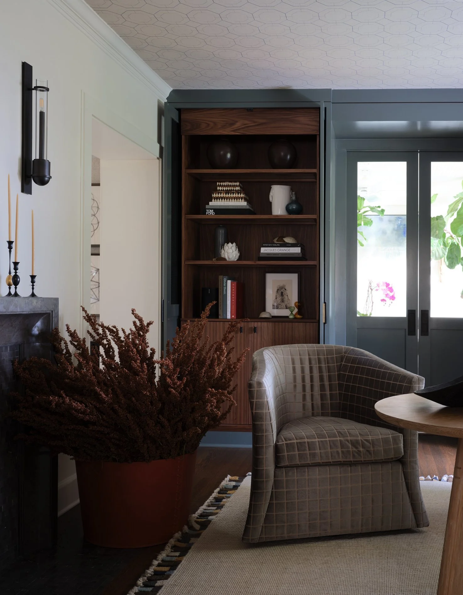 For this one room project, we were tasked with transforming the first room you see upon entering the house. We took this as an opportunity to set the tone for the rest of the home and introduce our client’s style. As the clients has a more relaxed separate living room with a television, we were able to create a more formal space catered to entertaining and conversation. We wanted the room to feel especially layered with texture, pattern, and antiques. The gridded velvet fabric we chose for the four swivel chairs centered in the room echoed the hard straight lines of the custom built bookcases and a beautiful marble fireplace mantle. These hard lines were balanced by a custom hand-woven tasseled rug, the warm wood carvings on an antique mirror found in Paris, and our custom walnut console. Luckily, the results spoke for themselves and we are excited to be moving onto other spaces in the home.