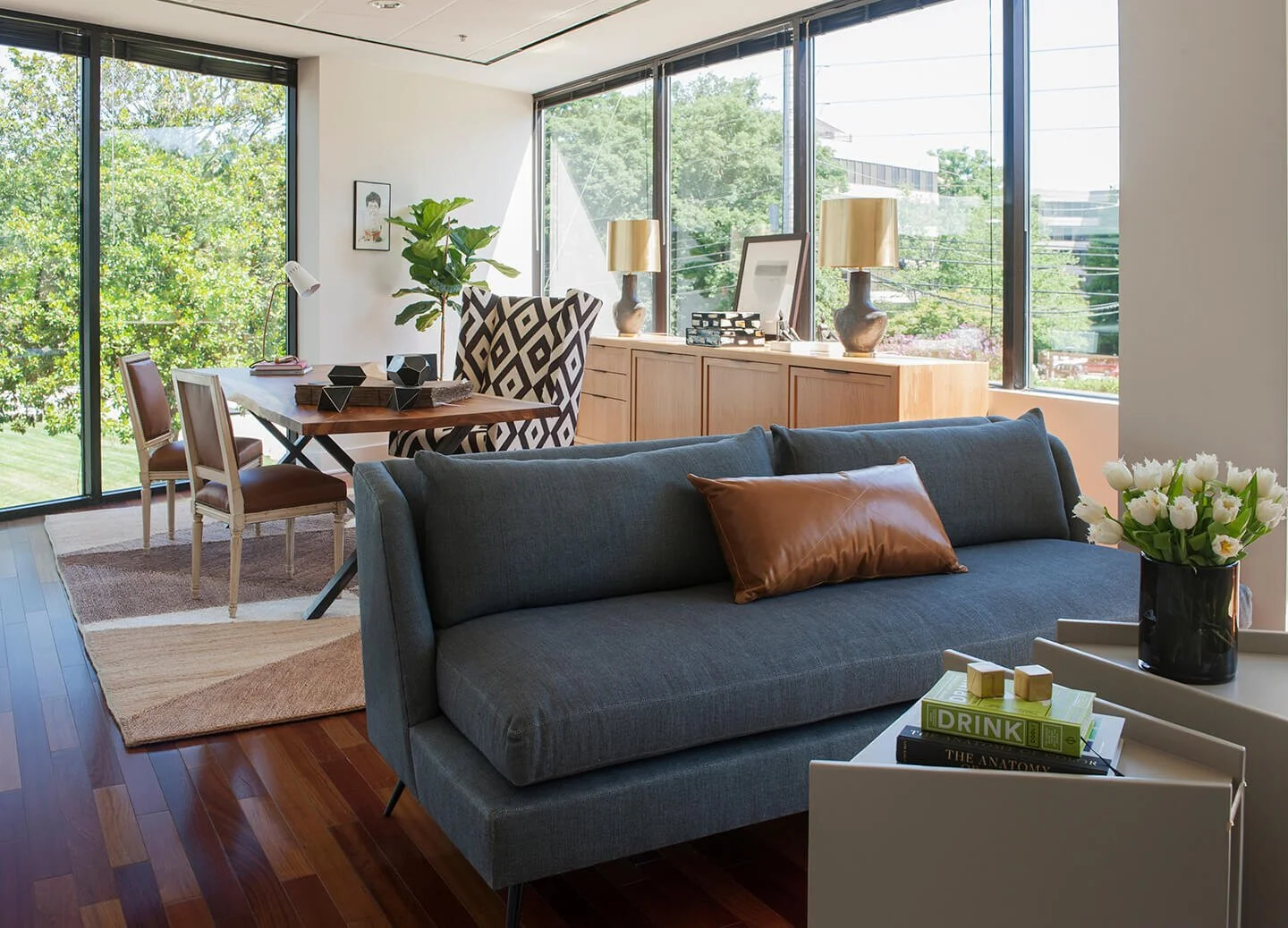 We wanted the CEO’s office at this workplace to have a thoroughly modern vibe and still feel approachable. This office needed to have multiple workspaces - desk work, one-on-one working, and a comfortable spot for group conversations. We incorporated a reclaimed wood desk with modern upholstery and graphic textiles and wallpaper.