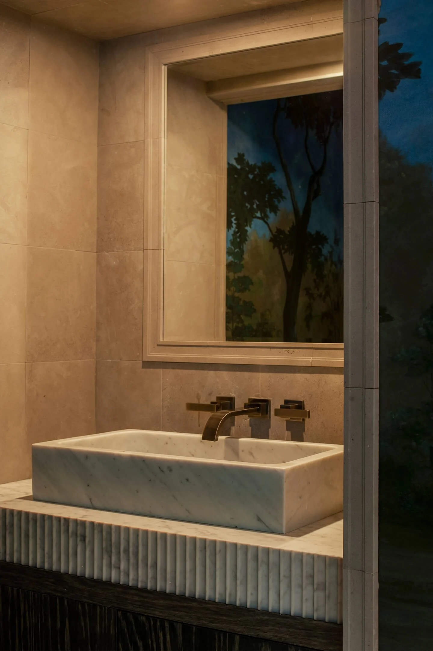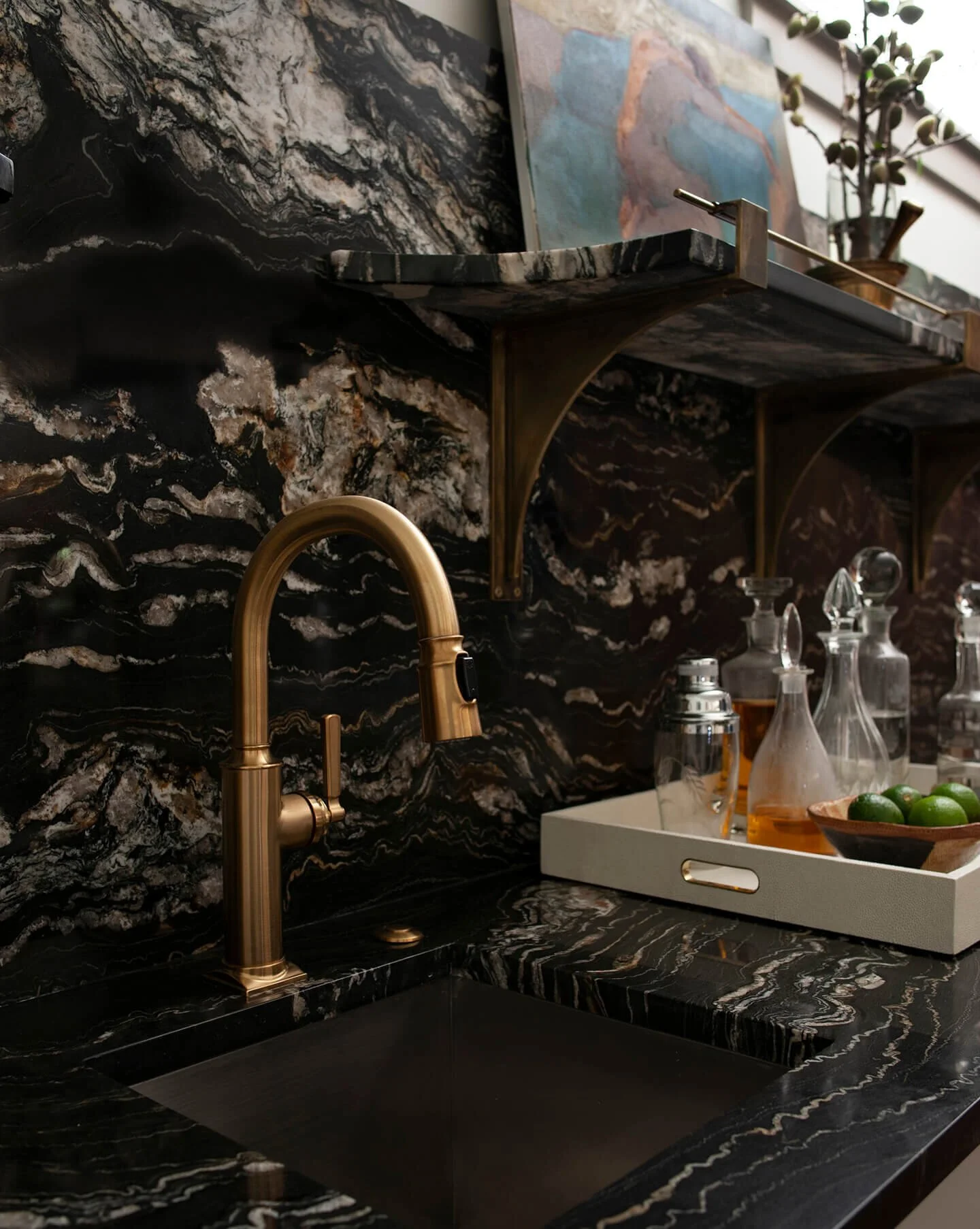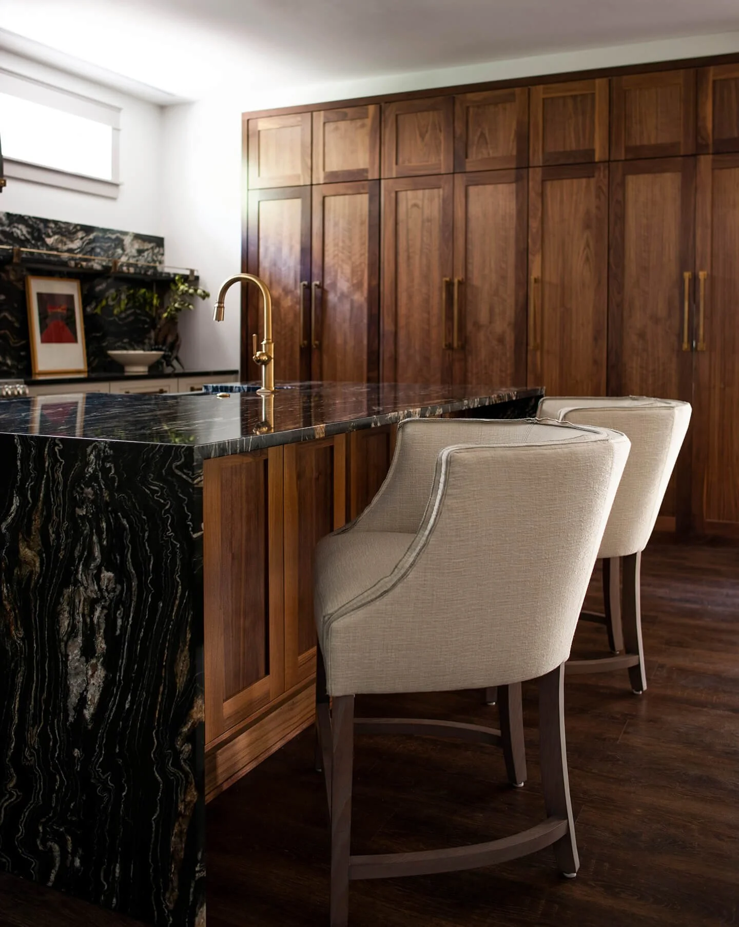 We were tasked with creating a secondary living space in the unfinished lower level of this client’s home. The kitchen was the centerpiece of the space and we strayed from conventional to create a one-of-a-kind space: the vent hood was custom designed and made by a local craftsman. We installed six semi-flush mount lights over the island to give the space a more open feel. The bathroom also was a showstopper with wallpaper designed and painted by a local artist.